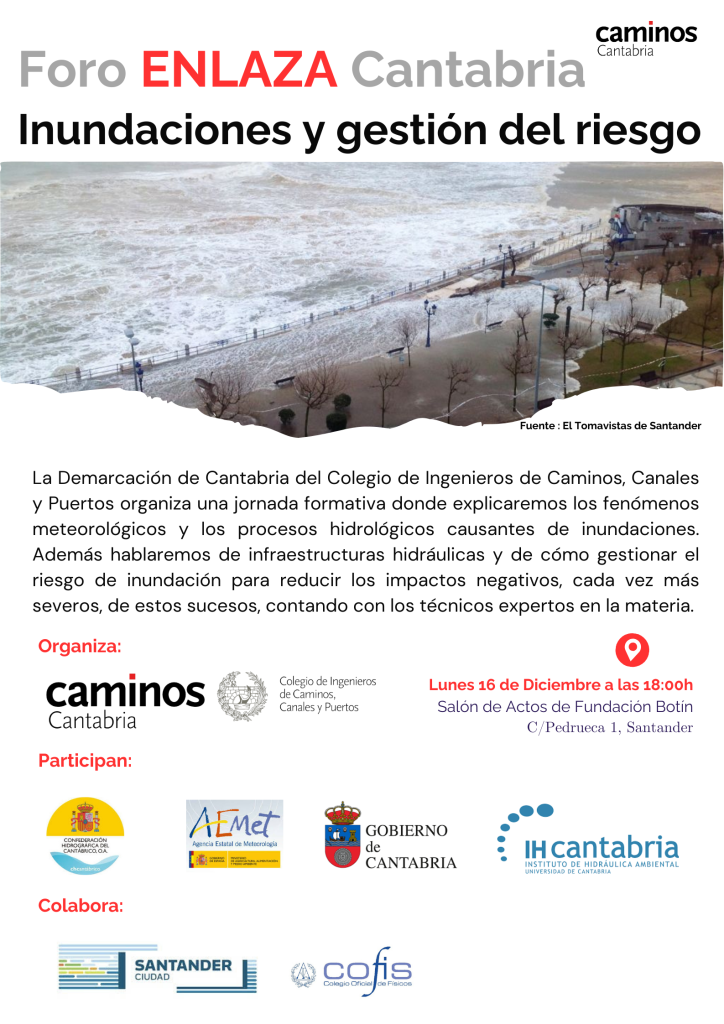La Demarcación de Cantabria del Colegio de Ingenieros de Caminos, Canales y Puertos celebrará un nuevo Foro ENLAZA que analizará las inundaciones y la gestión de riesgos de la mano de técnicos expertos en la materia.